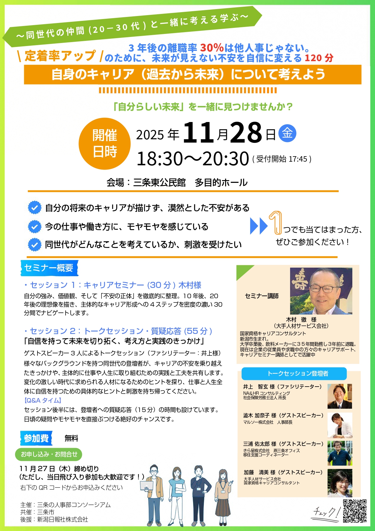第一部ではキャリアコンサルタントによる講義を実施し、 第二部では実践者3名によるトークセッションを通じて、 キャリアの不安をどう乗り越えてきたのか、 どのように未来を描いてきたのかをリアルにお伝えします🌱